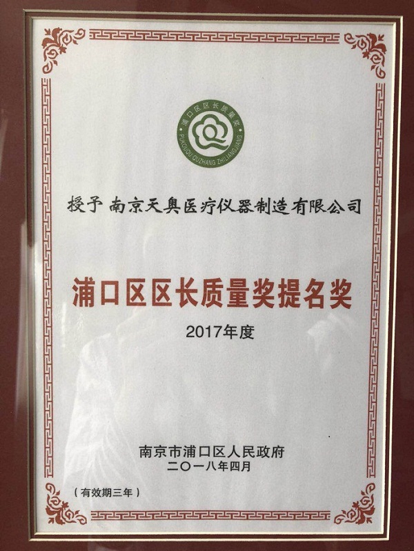 南京天奧醫(yī)療儀器制造有限公司榮獲“2017年浦口區(qū)區(qū)長質(zhì)量獎提名獎”和質(zhì)量強區(qū)工作區(qū)級“先進(jìn)單位”稱號。